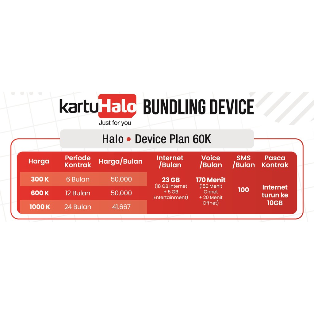 Daftar Harga Paket Internet Kartu Halo Terbaru 2021. Paket ini bisa didapatkan di berbagai titik layanan Telkomsel baik GraPARI maupun layanan pelanggan online. KartuHalo adalah layanan pascabayar Telkomsel yang dapat digunakan setiap saat 24 jam di semua jaringan Telkomsel 2G 3G dan 4G dengan berbagai benefit di antaranya prioritas jaringan untuk telepon saat traffic tinggi pembayaran tagihan yang dapat dilakukan melalui berbagai channel serta kemudahan memantau pemakaian dan detail tagihan.